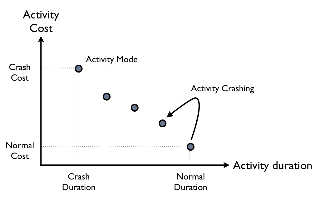 The aim of the critical path method is to schedule the project under a pre-defined scheduling objective, i.e. the choice of an activity mode for each activity to optimize a scheduling objective. A decrease in an activity‘s duration and the corresponding increase in the activity cost is known as activity crashing.